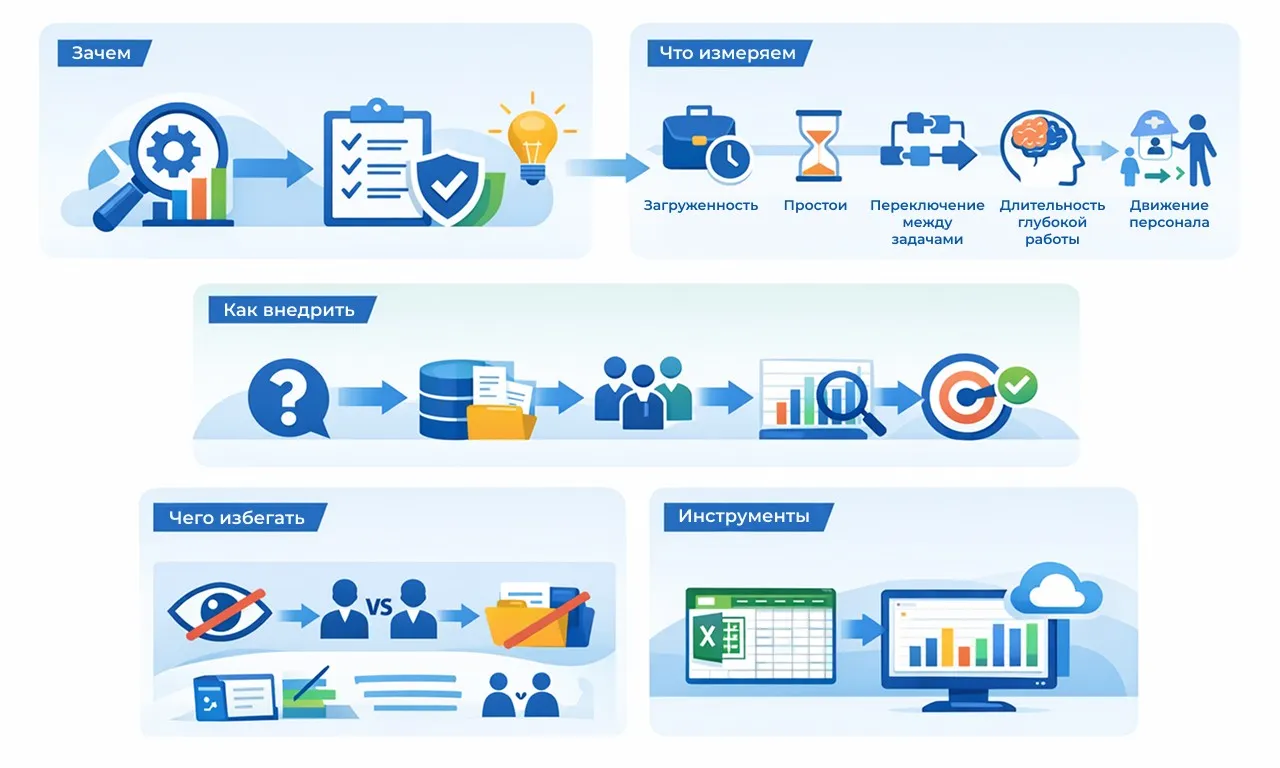 Начните с сегментации данных по ролям и задачам. Сравните план и факт: если расчет показывает, что 40% времени уходит на согласования, а не на задачи — вы нашли узкое место. Дополните цифры качественными инсайтами (опросами, интервью), чтобы понять контекст.