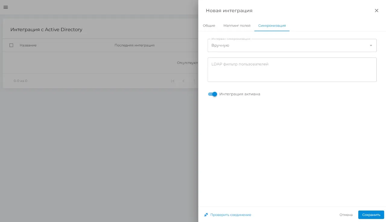 Установка дополнительного ПО на контроллер домена больше не требуется: достаточно указать параметры подключения и запустить синхронизацию. Ранее использовавшийся агент домена исключен из архитектуры решения, что упрощает развертывание и снижает нагрузку на инфраструктуру.