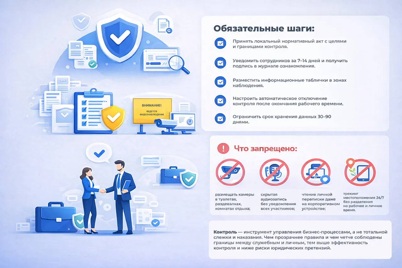 Контроль — инструмент управления бизнес-процессами, а не тотальной слежки и наказания. Чем прозрачнее правила и чем четче соблюдены границы между служебным и личным, тем выше эффективность контроля и ниже риски юридических претензий.