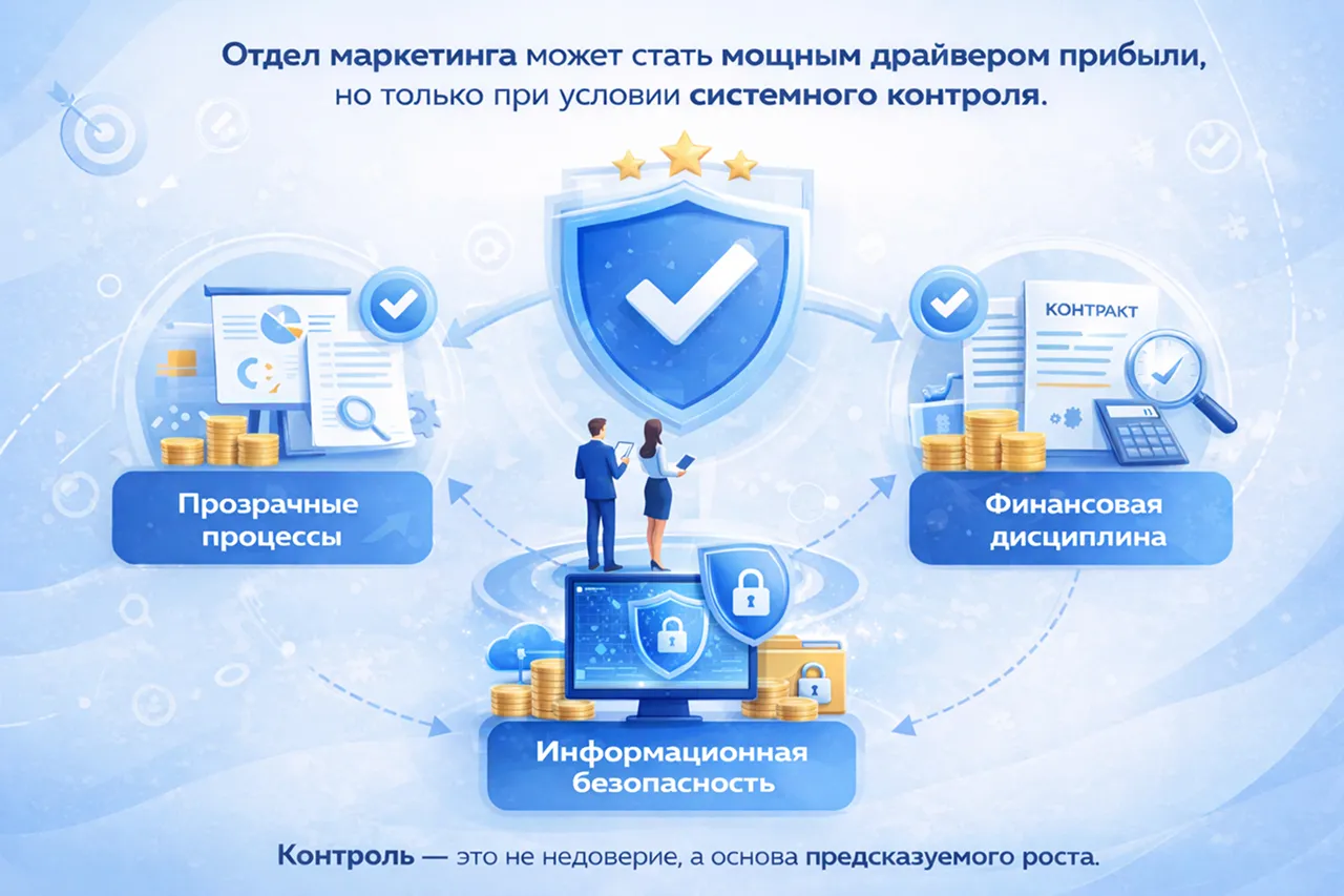 Отдел маркетинга — стратегический актив компании. Однако без четкой системы контроля даже самые талантливые специалисты могут работать вхолостую, а бюджет — уходить в пустоту. Как мы выяснили, эффективный контроль охватывает три ключевых направления: прозрачность процессов (регламенты, KPI, разграничение ответственности), финансовая дисциплина (аудит расходов, проверка контрактов) и, что особенно важно, информационная безопасность.