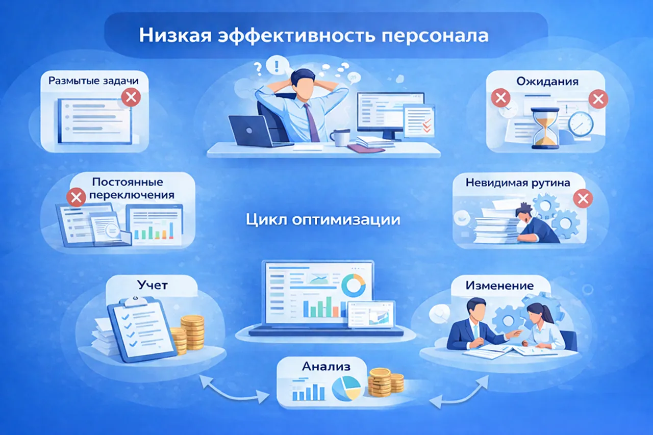 Оптимизация работы начинается с системного подхода — цикла «учет → анализ → изменение процесса». Когда данные используются для устранения барьеров, а не для наказаний, сотрудники получают ясность, фокус и время на действительно важные задачи, а компания — предсказуемость, качество и рост без выгорания.