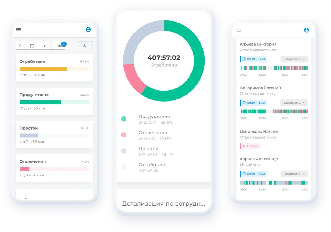 Я часто уезжаю в командировки. Раньше я не мог знать, чем занимаются сотрудники в мое отсутствие. Подозревал, что многие либо не работают, либо вообще не приходят в офис. Решил поставить ИНСАЙДЕР и узнал, что мои подозрения, увы, оправдались. Кто-то опаздывал, кто-то засиживался на обеде, кто-то практически не работал. Провел работу с коллективом, и после этого дисциплина в офисе нормализовалась. Благодаря ИНСАЙДЕРУ я могу больше не переживать, что сотрудники не работают, когда меня нет на месте. Теперь я вижу, что даже в мое отсутствие рабочий процесс идет нормально.