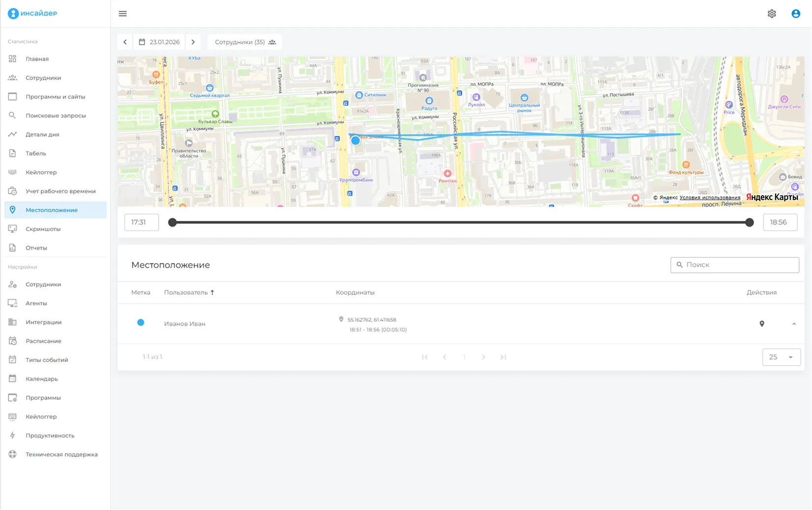 Решить эту проблему помогает система мониторинга и оценки эффективности «ИНСАЙДЕР», которая обеспечивает прозрачность процессов через GPS-трекинг, учет рабочего времени и контроль активности на мобильных устройствах.