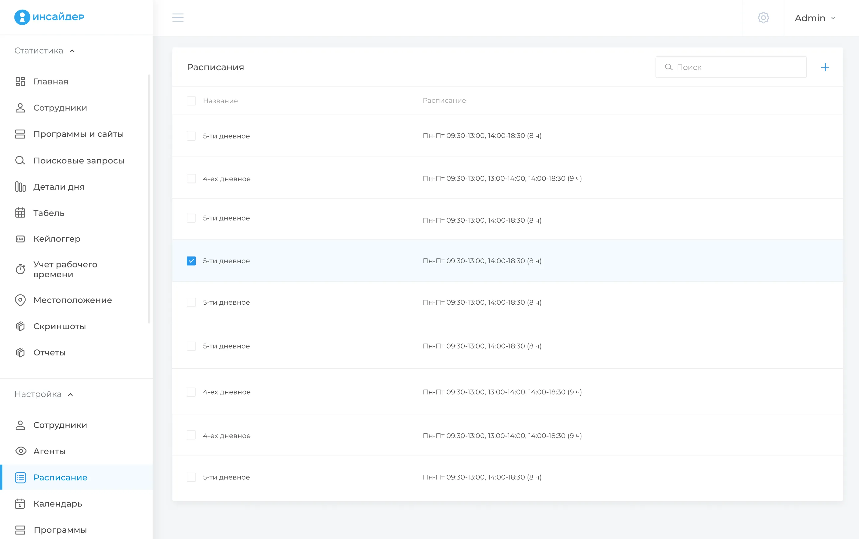 Планировщик рабочего дня. Позволяет учитывать разные графики работы — 2/2, 3/1 и 5/2, а также настраивать индивидуальные расписания для каждого сотрудника.