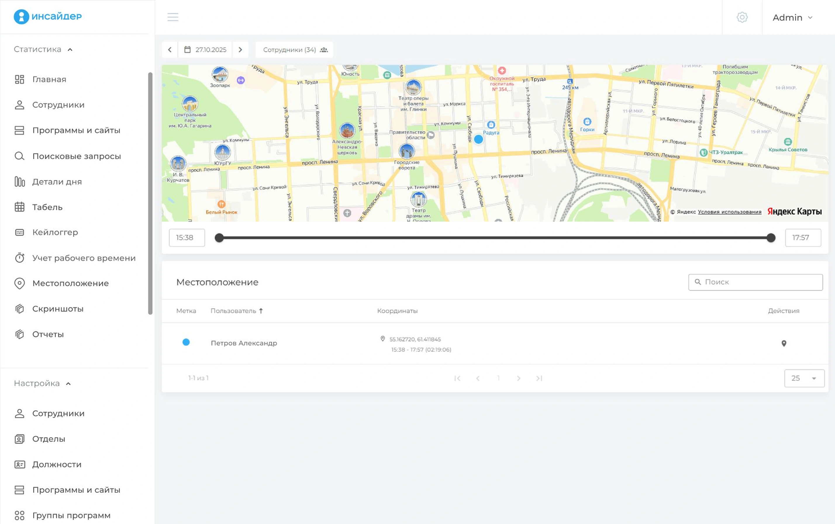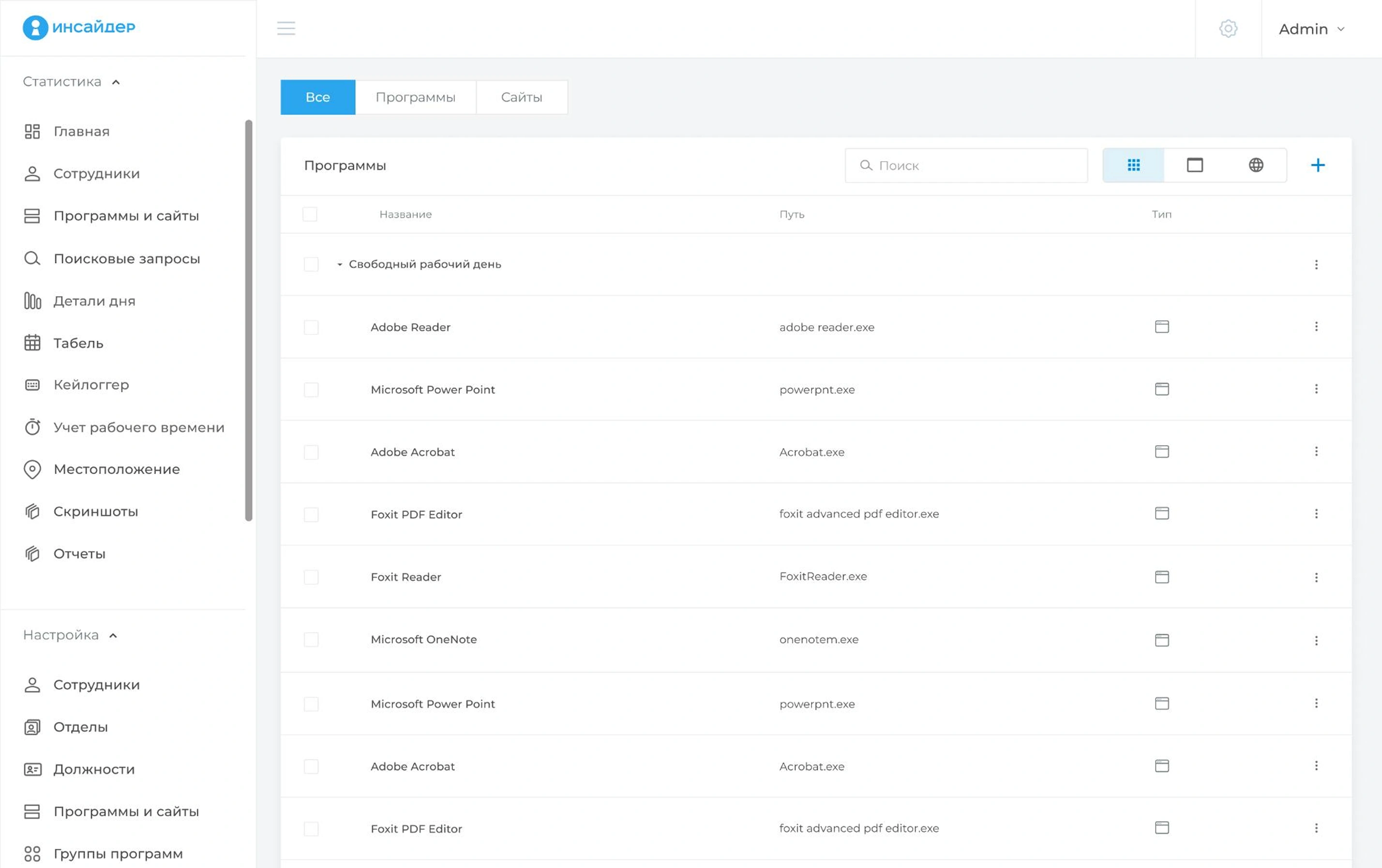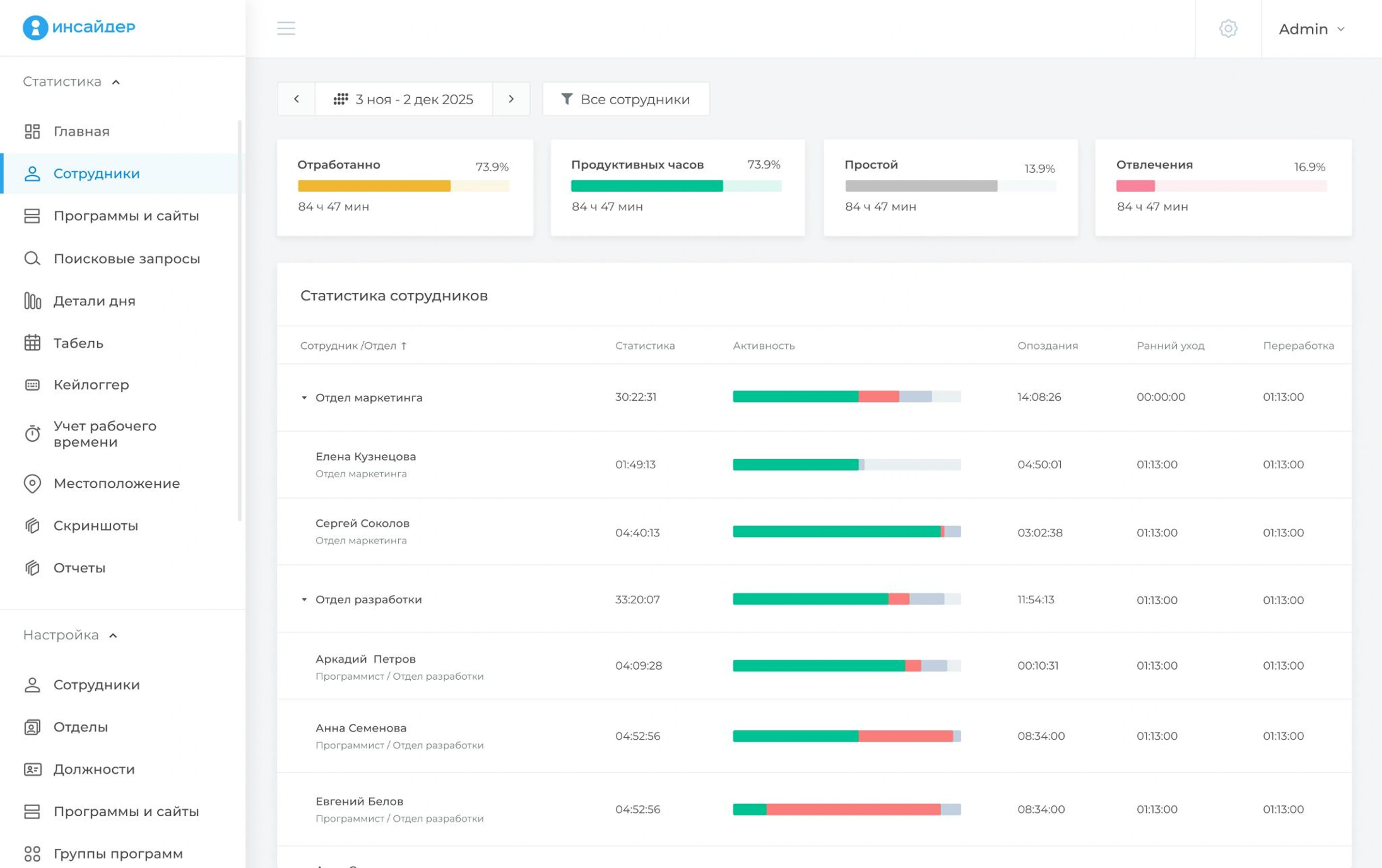 «ИНСАЙДЕР» является комплексной системой учета, которая позволяет контролировать рабочее время, определять эффективность деятельности удаленных сотрудников, работающих на мобильных устройствах и ПК. С помощью программы можно увеличить эффективность работы персонала более чем на 30%, а также узнать, как именно специалисты используют свое время. Система отслеживает динамику выполнения поставленных задач, определяет степень загруженности персонала, выявляет действия, которые нарушают трудовую дисциплину и снижают эффективность работы компании.