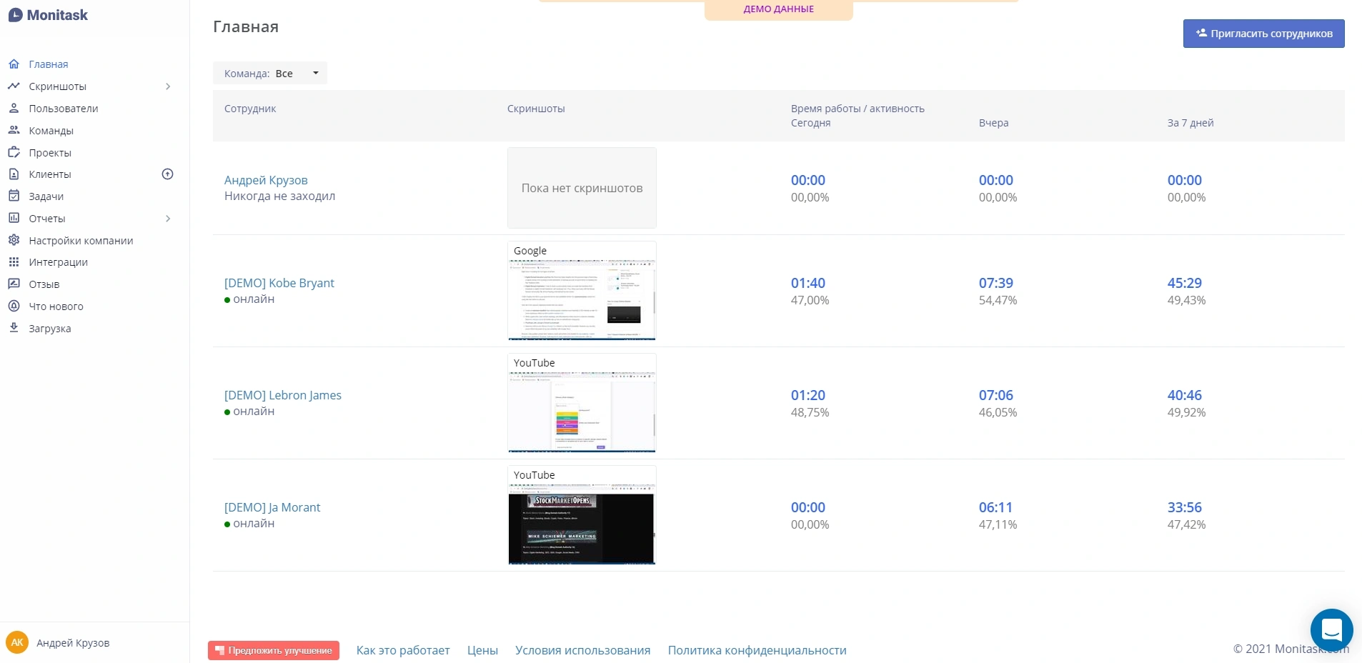 Сервис является качественным инструментом для оценки КПД сотрудников. Monitask позволяет контролировать эффективность и вовлеченность каждого члена команды, повысить продуктивность и дисциплинированность удаленных специалистов.