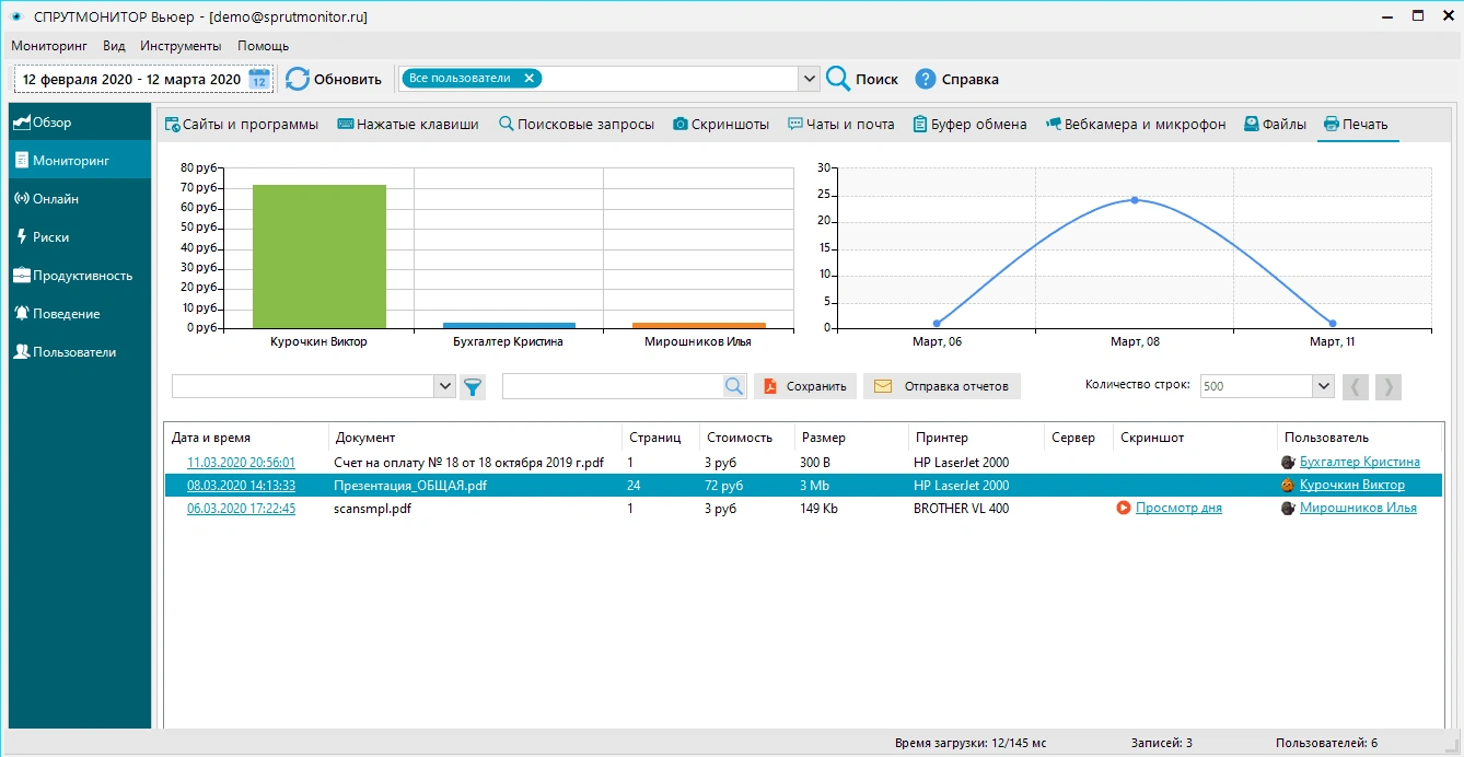отслеживание действий персонала за ПК в реальном времени;