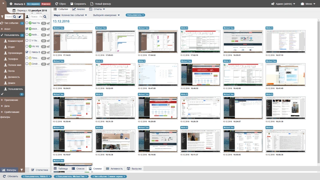 Многофункциональный облачный сервис для комплексного контроля удаленных сотрудников. Помимо отслеживания общей активности, сервис фиксирует запущенные приложения, подключенные устройства, ведет лог нажатий клавиш, контролирует печать документов, делает регулярные скриншоты, записывает видео с веб-камер и аудио с микрофонов, а также анализирует переписки в более чем 20 популярных мессенджерах.