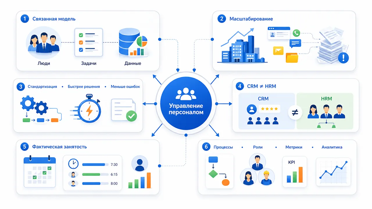 Эта статья будет полезна собственникам бизнеса, HR-менеджерам, операционным директорам и руководителям подразделений, которые хотят выстроить современный и управляемый подход к работе с командой. Разберем, из чего состоит система управления персоналом, какие задачи она решает, где нужна автоматизация, как связаны HRM, CRM и другие информационные платформы, а также почему без объективных данных сложно добиться стратегического улучшения процессов.