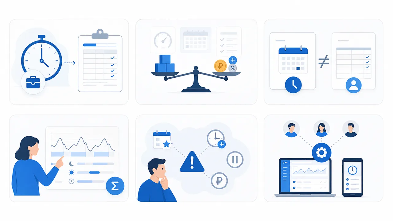 Главный риск при сдельной системе возникает не в самой формуле начисления, а в разрыве между выработкой, графиком работы и фактическим присутствием. Если компания учитывает только объем выполненной работы, но слабо фиксирует рабочее время, быстро появляются споры о переработках, простоях, недоработке до нормы, доплатах и минимальных гарантиях по зарплате.