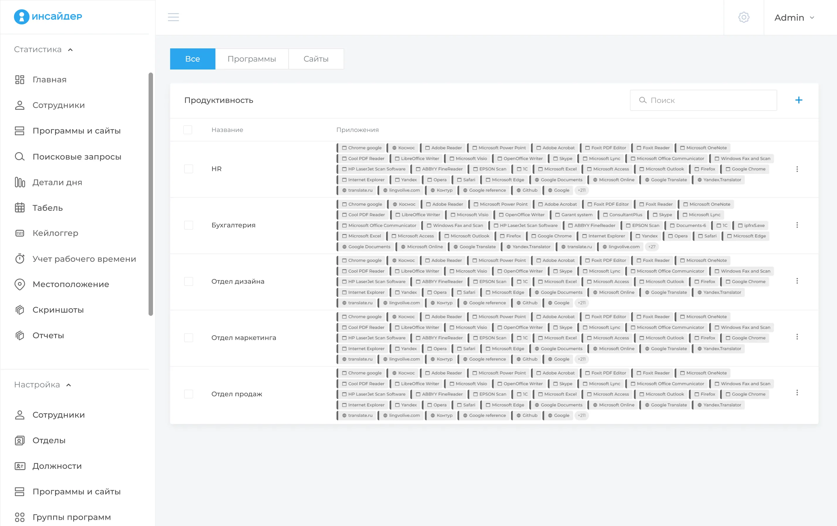 ИНСАЙДЕР отслеживает запуск и использование приложений в течение дня, а также время взаимодействия с каждым ресурсом, и составляет рейтинг программ и сайтов, с которыми сотрудник работает чаще всего.